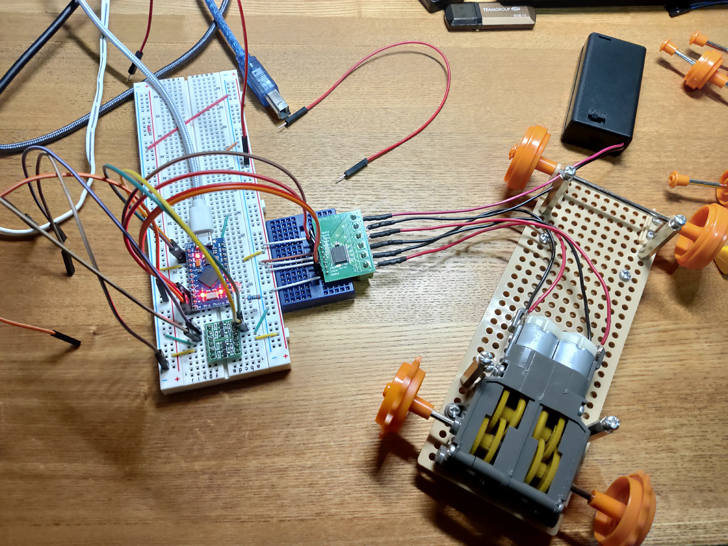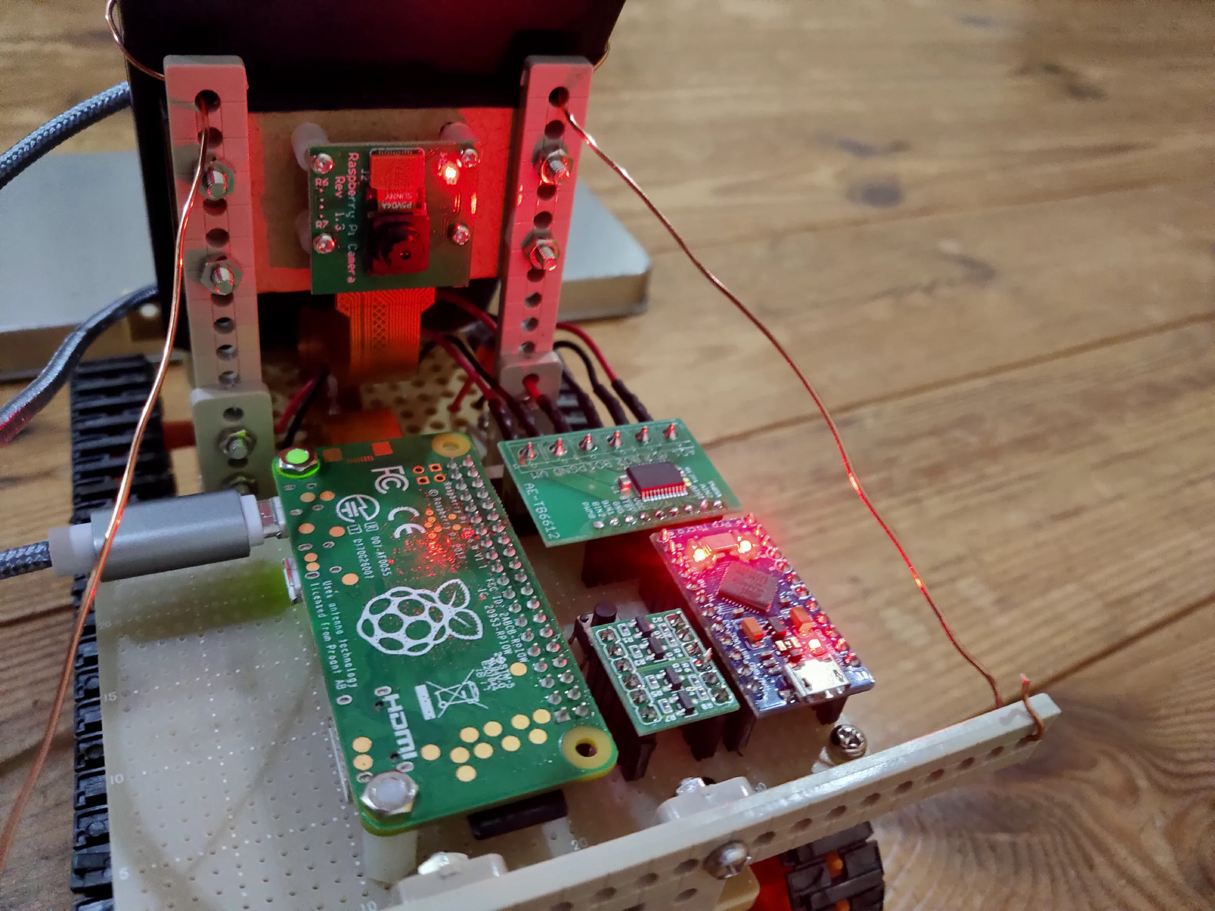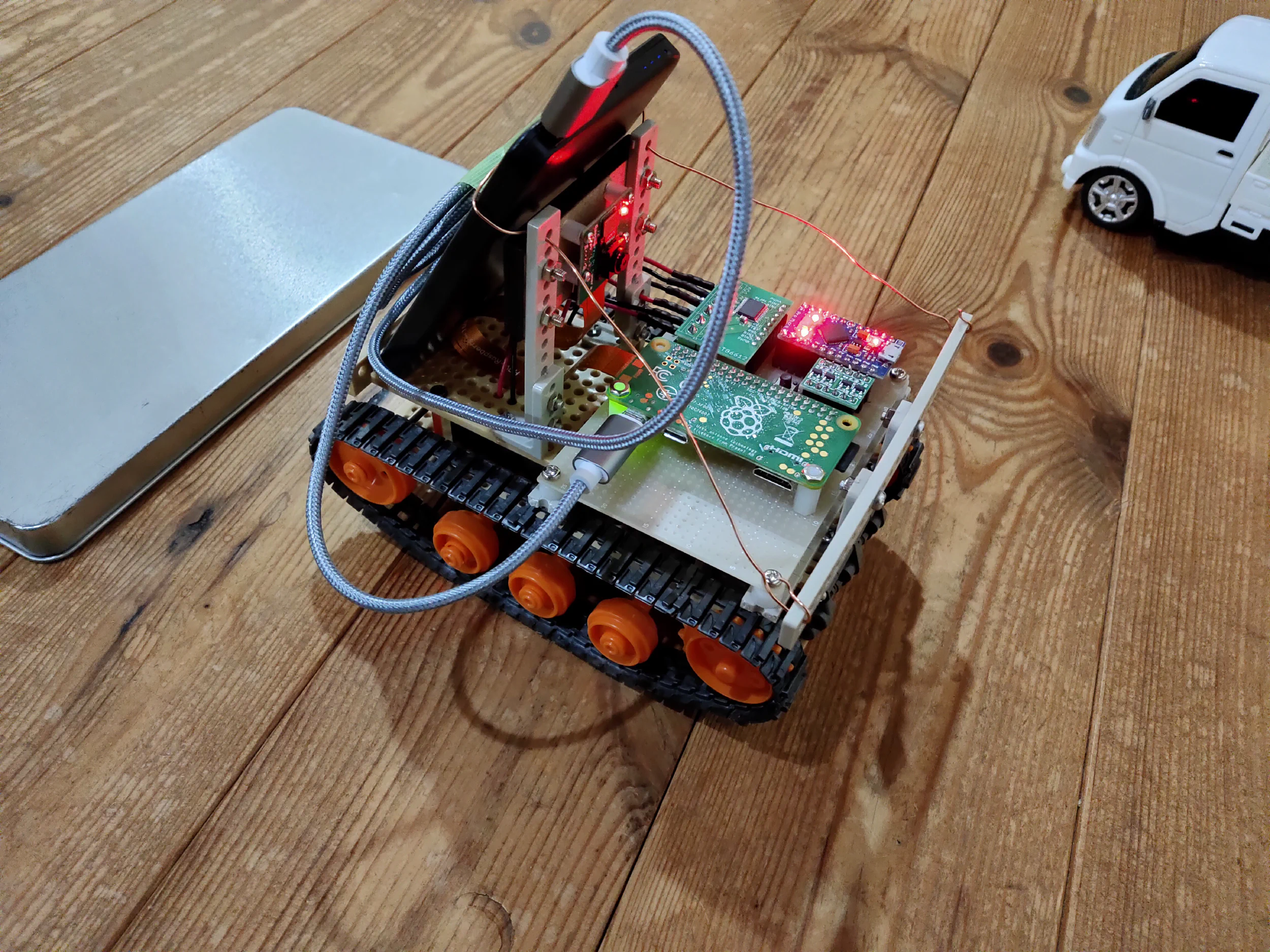 数日後、モータードライバーが届いたので完成しました。ちなみに、Arduino microも破壊して書き込めなくなりましたが、こちらはもともと2つ持っていたので事なきを得ました。Raspberry Piとモバイルバッテリーの接続が非常に汚いですが、めんどくさくなってこうなりました。