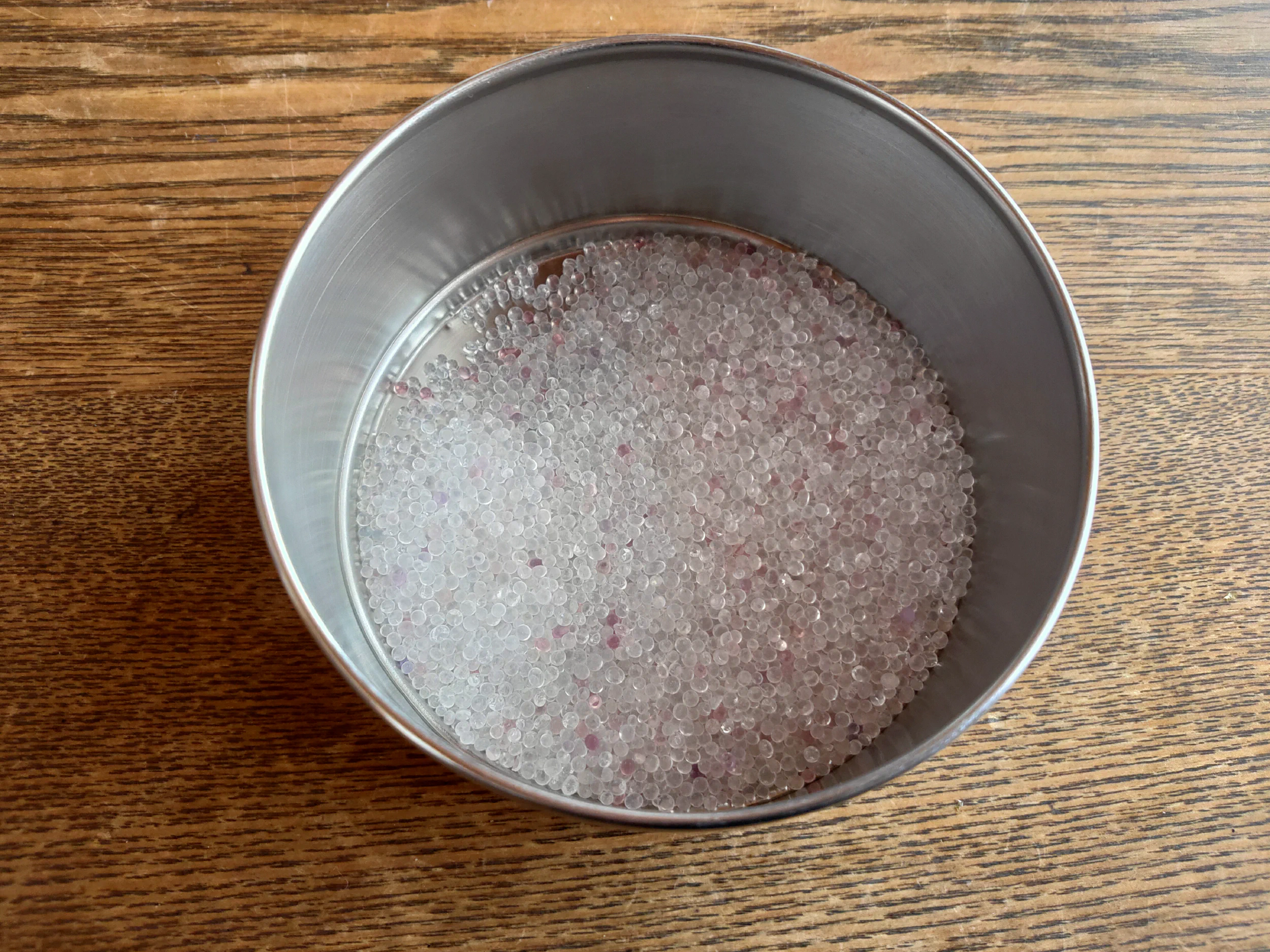 今回は実験的に少量の(40g程度)のシリカゲルでやってみましたが,実際にはもっと多くのシリカゲルを一度に乾燥させたいので,金属製のトレーやバットのようなものにシリカゲルを広げると良さそうだと思いました.シリカゲル自体は180℃ほどまで耐えられるようですので,徐々に温度を上げていこうと思います.