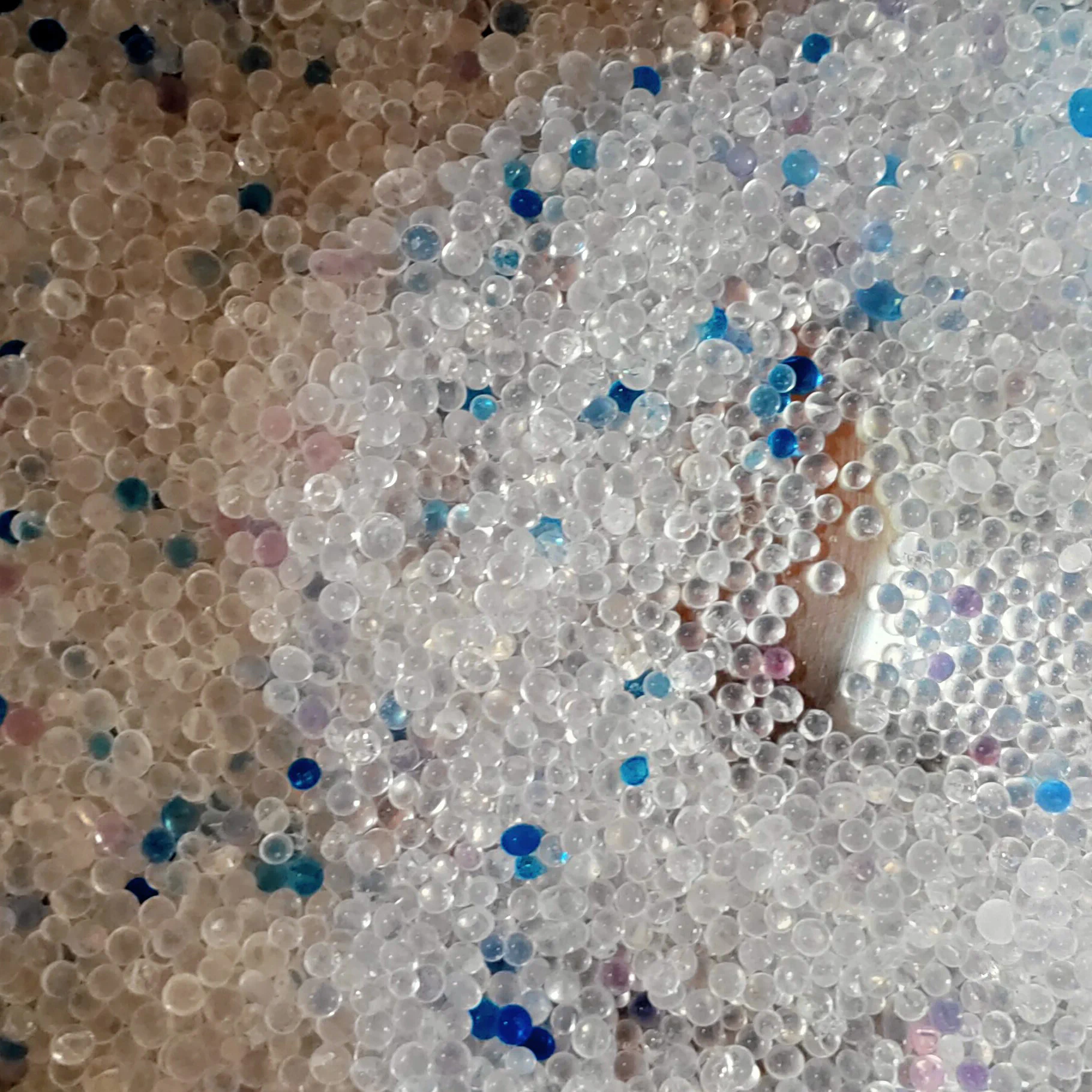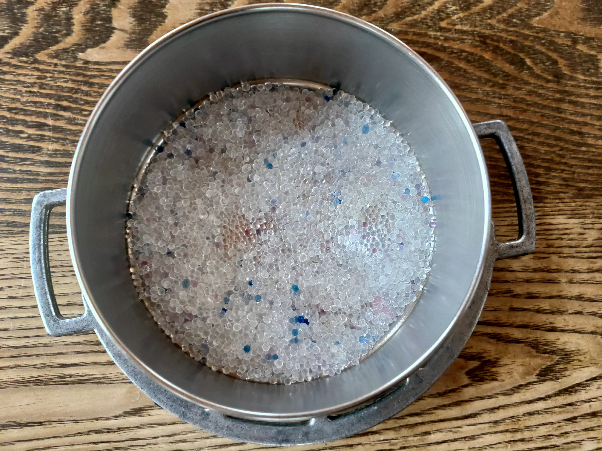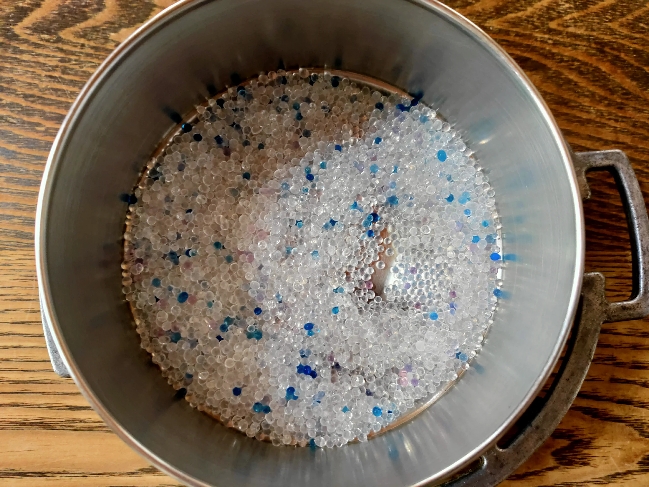 一見,ほとんどのシリカゲルが乾燥できているように見えるのですが,少し混ぜてみると下の方から赤色のシリカゲルが出てきました.